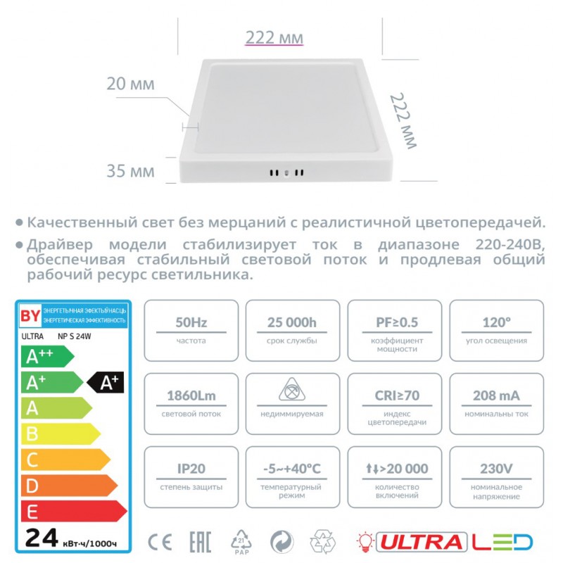 Размер лампы | 225х225х35 мм |